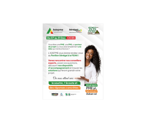 Du 7 au 31 décembre, retrouvez nos équipes au Pavillon Sénégal – Village ADEPME, où nos bureaux seront temporairement délocalisés pour etre au plus près des entrepreneurs, des acteurs économiques et du grand public.
